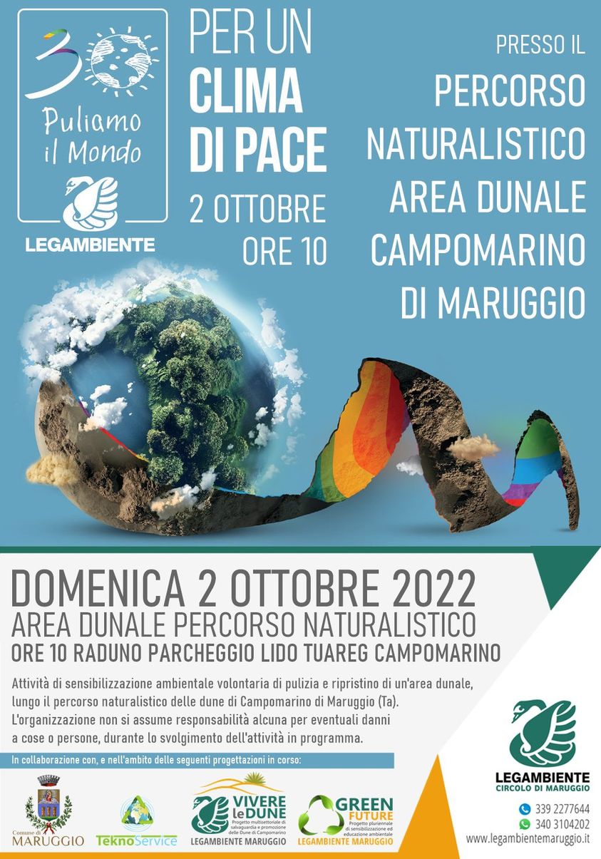 Anche quest’anno i volontari dell’APS Legambiente Maruggio, in collaborazione con quanti vorranno partecipare; nella mattinata di domenica 2 ottobre, si adopereranno in attività di pulizia volontaria di un tratto di area dunale presso il percorso paesaggistico a Campomarino.