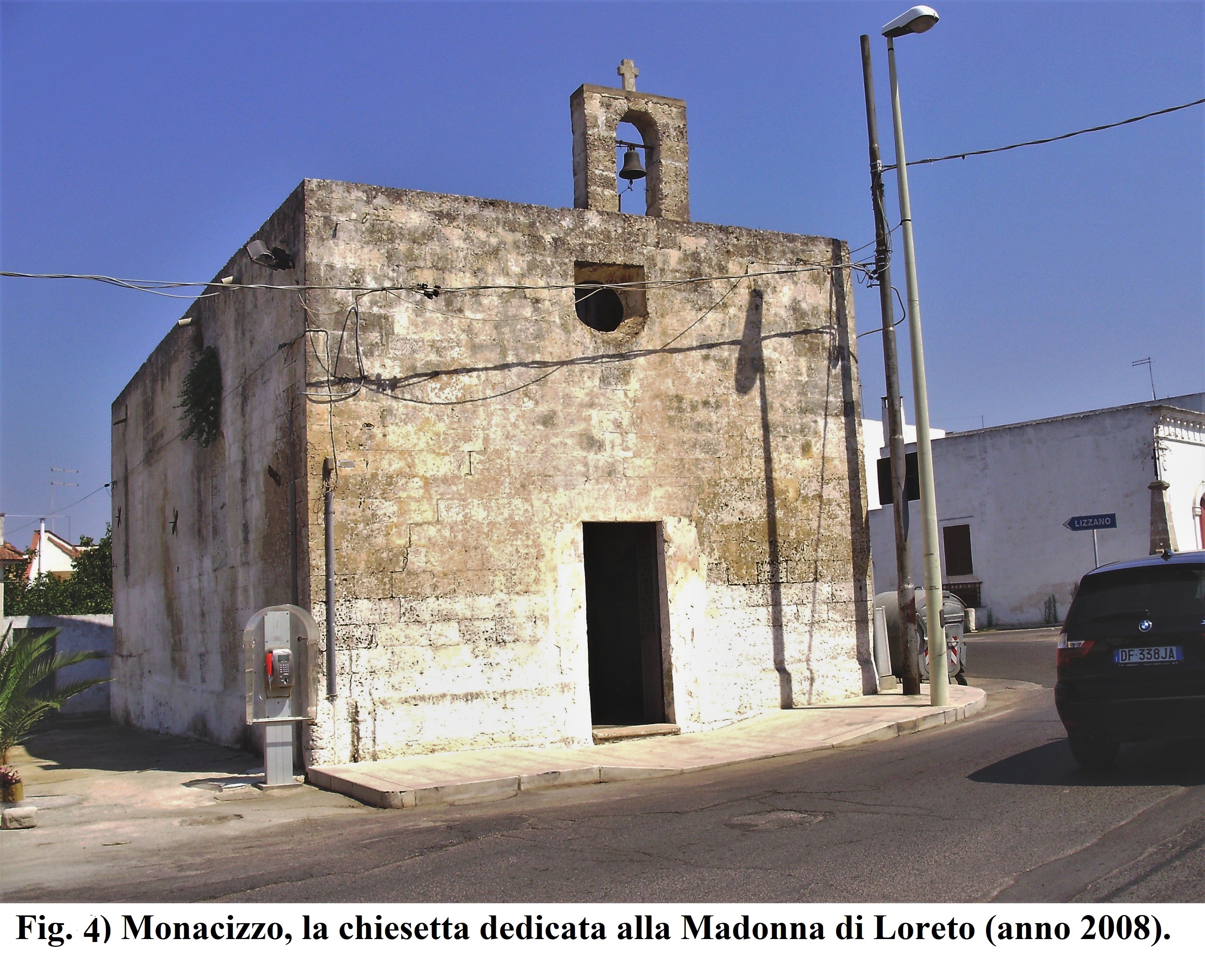 Segnalata come “Cappella di Loreto” in uno scritto del XIX secolo (N. ARDITI, La corografia fisica e storica della Provincia di Terra d’Otranto, Lecce, stab. Scipione Ammirato, 1879-1885, p. 358), verso la fine del secolo (6 Maggio1894) la nostra chiesetta riceve la visita di Pietro Alfonso Jorio, Arcivescovo di Taranto; questi ne ordina l’interdizione perché apparsa in cattive condizioni, in quanto “gli abitanti di Monacizzo  non si erano curati  di tenerla pulita e in ordine”. Opportunamente “riattata e messa in ordine” è riaperta al culto pubblico con Decreto datato 15 Marzo 1897; durante l’omelia pronunciata in occasione della ribenedizione dell’edificio avvenuta nel successivo 19 Marzo (festa di S. Giuseppe), l’Arciprete D. Cosimo Benedetto (coadiuvato da D. Antonio Corigliano di Lizzano ed al cospetto del popolo “intervenuto tutto”)   esortava i presenti a salutare la Madre Maria ogni volta che passavano davanti alla Cappella “per continuare la devozione degli antichi padri che avevano costruito quel luogo di culto” (M. SPINOSA, vol. cit., pp. 389-390).