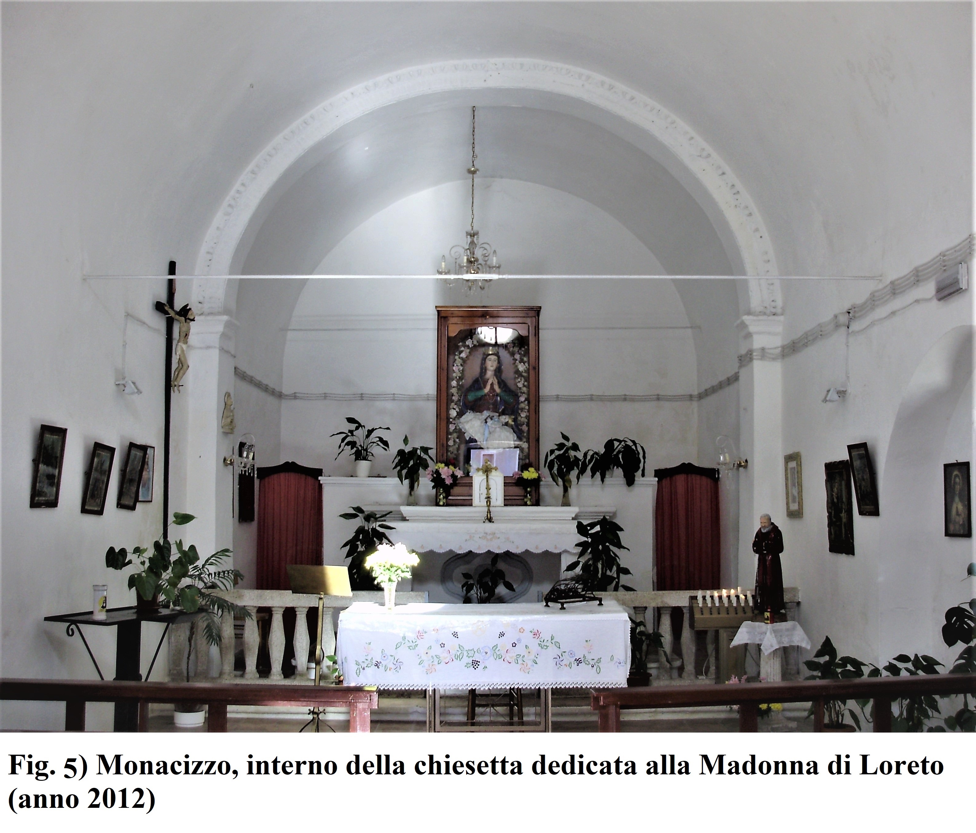 Nello stesso secolo il Catasto Onciario di Monacizzo (1742-49) registra spese per festività religiose solenni e patronali (tra cui quella per la Beata Vergine di Loreto) per un totale di ducati 15; in questo stesso documento si cita Donato Cavallone “Bracciante libero di anni 40 che abita nella casa dell’Eremita sotto la Madonna di Loreto, stando servendo la detta Cappella” (M. SPINOSA, vol. cit., pp. 406-408, 439).