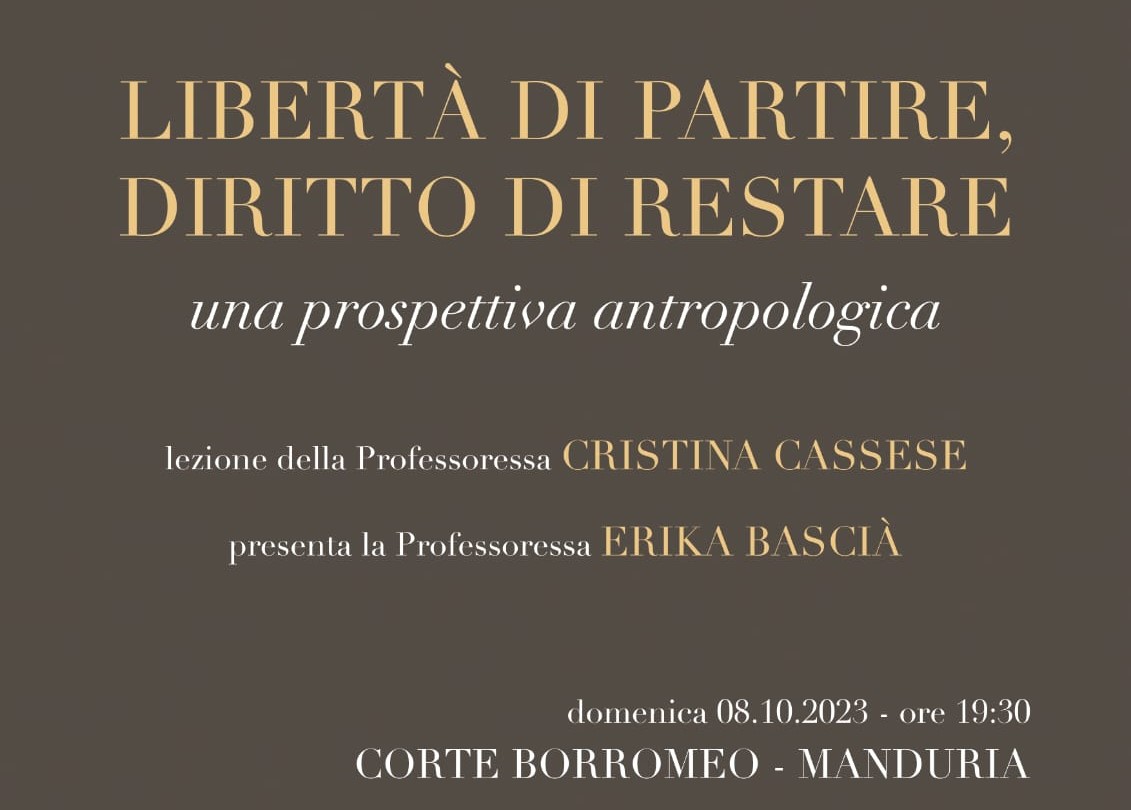 Domenica 8 ottobre, negli incantevoli ambienti di Corte Borromeo a Manduria, alle ore 19:30, l’associazione “La Lumaca” ospita Cristina Cassese, un’antropologa culturale, “nomade professionista” dal 1999.