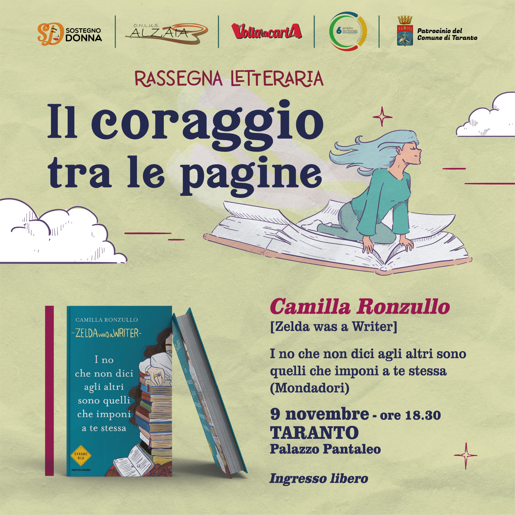 Si comincia questo giovedì, 9 novembre. Ospite del primo appuntamento è Camilla Ronzullo, ai più nota come Zelda was a Writer, molto seguita su Instagram e sul blog che cura dal 2009. Alle 18.30 a Palazzo Pantaleo, a Taranto, verrà presentato il suo ultimo libro, I no che non dici agli altri sono quelli che imponi a te stessa, pubblicato da Mondadori. Dialogherà con l’autrice Vincenzo Parabita.