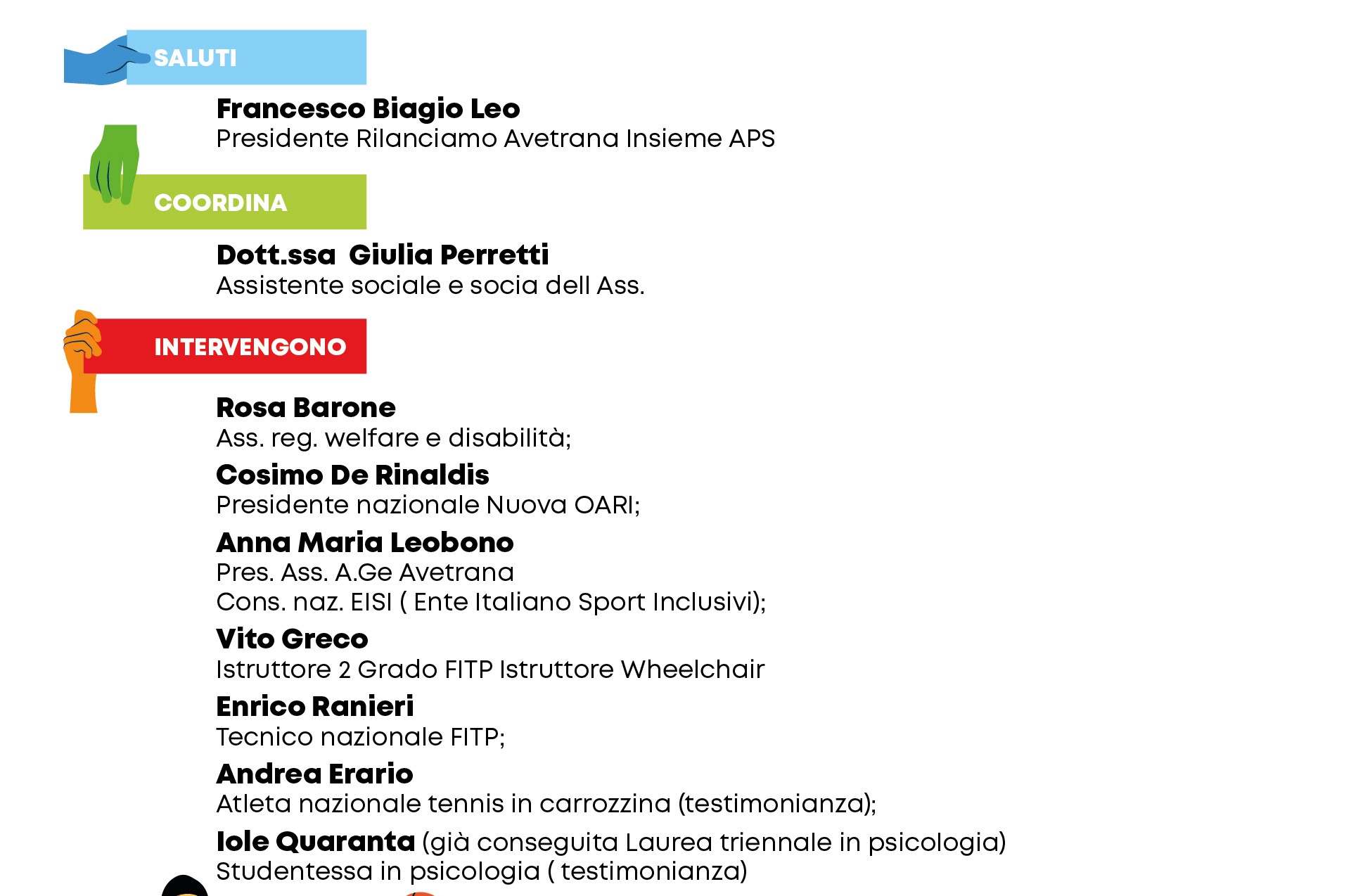 Intervengono Rosa Barone, assessore regionale al Welfar e alla Disabilità; Cosimo De Rinaldis, presidente nazionale Nuova OARI; Anna Maria Leobono, presidente dell’associazione A.Ge. di Avetrana e consigliere nazionale dell’Ente Italiano Sport Inclusivi; Vito Greco, istruttore di secondo grado FITP (istruttore Wheelchair); Enrico Ranieri, tecnico nazionale FITP; Andrea Erario, atleta nazionale tennis in carrozzina; Iole Quaranta, studentessa in Psicologia.