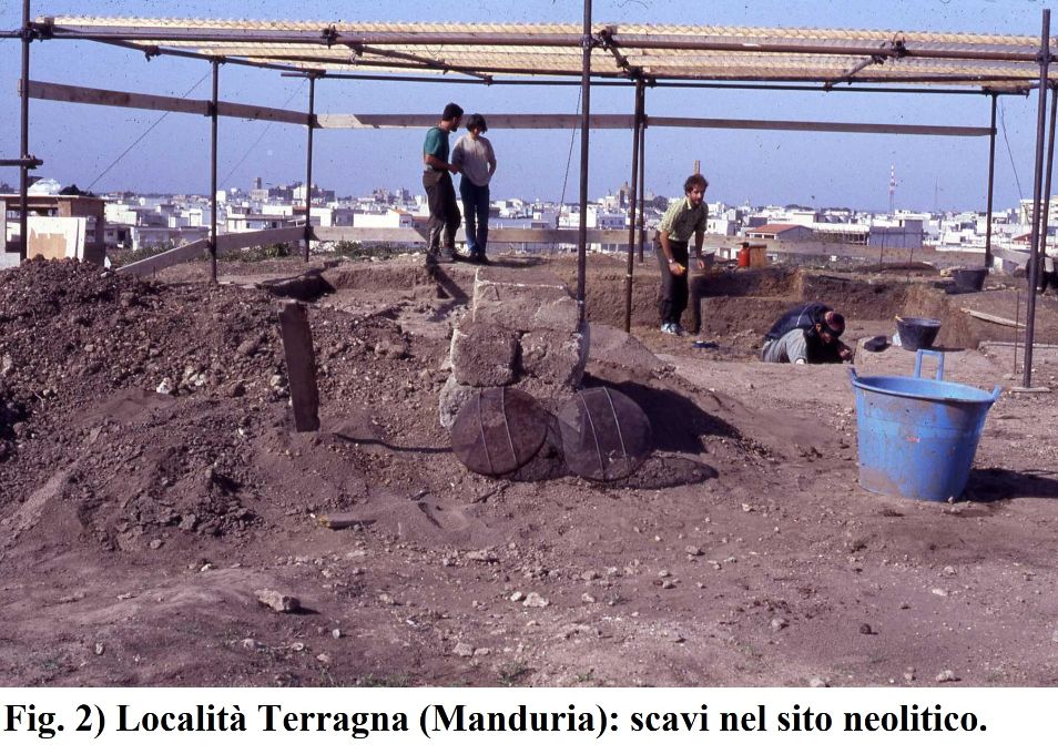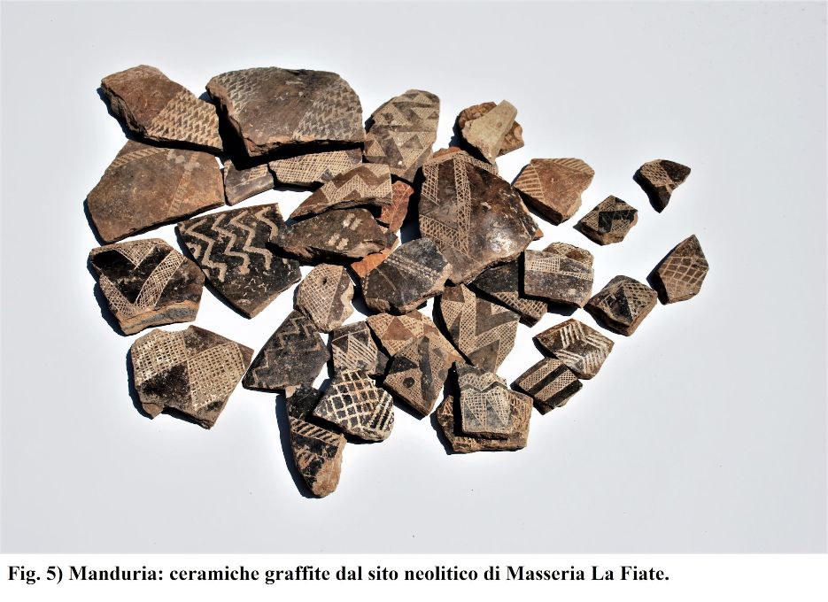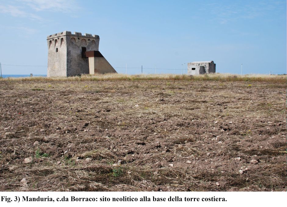Tra i villaggi presenti sul territorio di Manduria, il sito di masseria Le Fiate-Bagnolo, a breve distanza dalla frazione di Uggiano Montefusco, si distingue per l’ampiezza dell’area occupata e per la dovizia di reperti ceramici e litici recuperati; si aggiunge il pianoro di Terragna, nell’immediata periferia occidentale di Manduria, per la documentazione archeologica riferibile a varie fasi, anche molto antiche, del Neolitico; e come non segnalare, lungo il tratto marino, il sito di Borraco, capace ancora di documentare, alla base della torre costiera cinquecentesca, l’esistenza di un villaggio di capannicoli; villaggio caratterizzato, tra l’altro,da frequenti conchiglie marine, spesso forate all’apice, logicamente collegabili con il gusto artistico ed ornamentale (antiche collane?), di queste genti. Più ad oriente, a confine col territorio di Avetrana, nei pressi dellelocalità Marina – Quarto Grande, un’areaneolitica, di recente scoperta (anno 2022),ha restituitoi resti di uno scheletro umano in posizionerannicchiata,documentando, in zona, la pratica dell’inumazione già attestata da altre testimonianze analoghe segnalate in ambito nazionale.