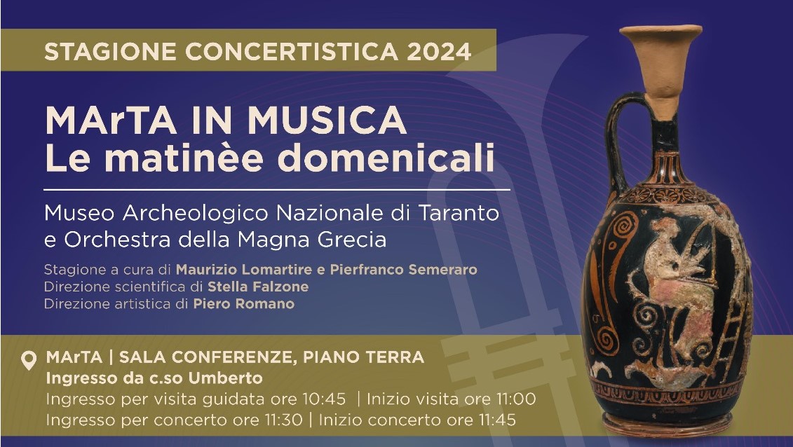 Le matinèe domenicali – MarTA in Musica e MarTA, una collaborazione di successo che si conferma anche per il 2024. Una rassegna di stelle della musica classica e del pop in una serie di concerti che avranno luogo nella sede del Museo Archeologico Nazionale di Taranto diretto dalla nuova direttrice, la dott.ssa Stella Falzone. La presentazione della rassegna martedì 23 gennaio alle 11.00 nella Sala conferenze dello stesso MArTA. Presenti, oltre alla direttrice, i curatori del programma, i Maestri Maurizio Lomartire e Gianfranco Semeraro, e il direttore artistico dell’ICO Magna Grecia, il Maestro Piero Romano.