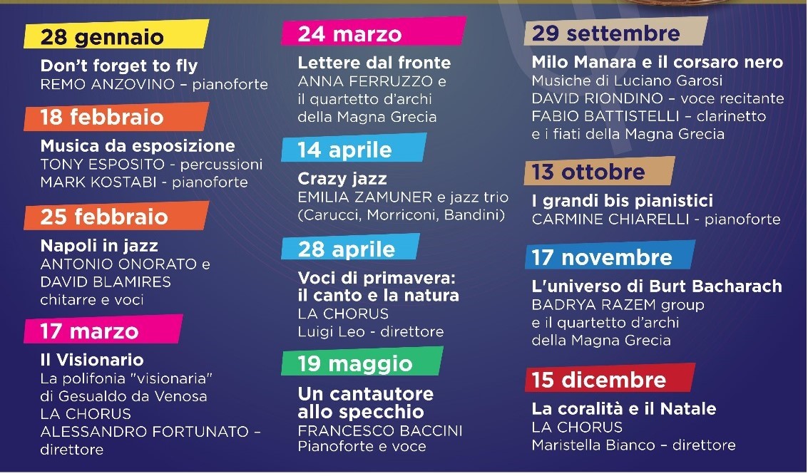 La polifonia “visionaria” di Gesualdo da Venosa, il 17 marzo sarà rappresentata dal L.A. Chorus nel progetto “Il Visionario”. A seguire, protagonista dell’appuntamento del 24 marzo, “Lettere dal fronte”, sarà l’attrice Anna Ferruzzo con il Quartetto d’archi dell’Orchestra della Magna Grecia. La pianista Emilia Zamuner sarà, invece, la protagonista di “Crazy jazz”, accompagnata dal trio jazz Carucci-Morriconi-Bandini.