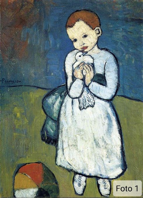 La predilezione artistica di Picasso per questo volatile risale agli anni giovanili. Del 1901 è ‘Bambina che stringe al petto una colomba’ (foto 1). La produzione artistica delle Colombe della Pace picassiane ha inizio nel 1949, ma è tragicamente preceduta da una colomba ‘impazzita’— come scrive Dario Mastromettei in un’analisi del dipinto ‘Guernica’ del 1937. La colomba qui raffigurata è quasi impercettibile, una macchia bianca su uno sfondo scuro, come a volersi eclissare dal messaggio di pace che, ad di là delle apparenze, il dipinto intende esprimere.