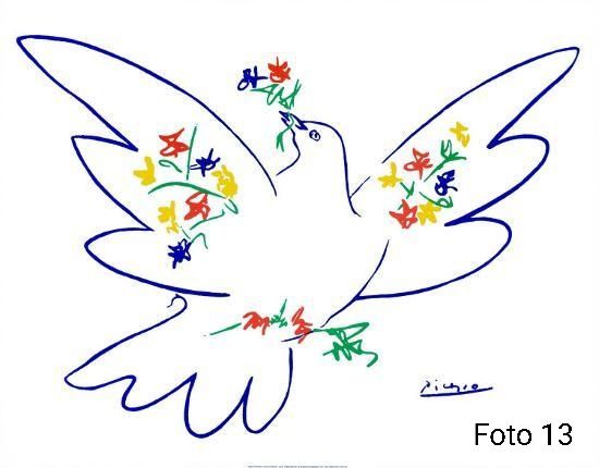 Chiude il lungo periodo picassiano delle ‘Colombe delle Pace’, la ‘Colomba con Sole’ del 1962, in cui è raffigurato l’atterraggio del volatile su una catasta di armi distrutte (foto 12).