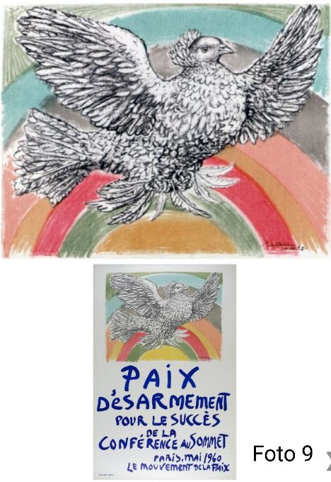 Sempre del 1952 è la ‘Colomba in Volo con Arcobaleno’, utilizzata nel 1960 come emblema pacifista nel manifesto del Vertice del Congresso per il Disarmo (Parigi, maggio 1960) (foto 9). Questa colomba dai tratti decisi e dall’espressione altera volò alto fino in Cina, dove Mao Zedong ne fece riprodurre la figura su una serie di francobolli nazionali emessi nel 1953.