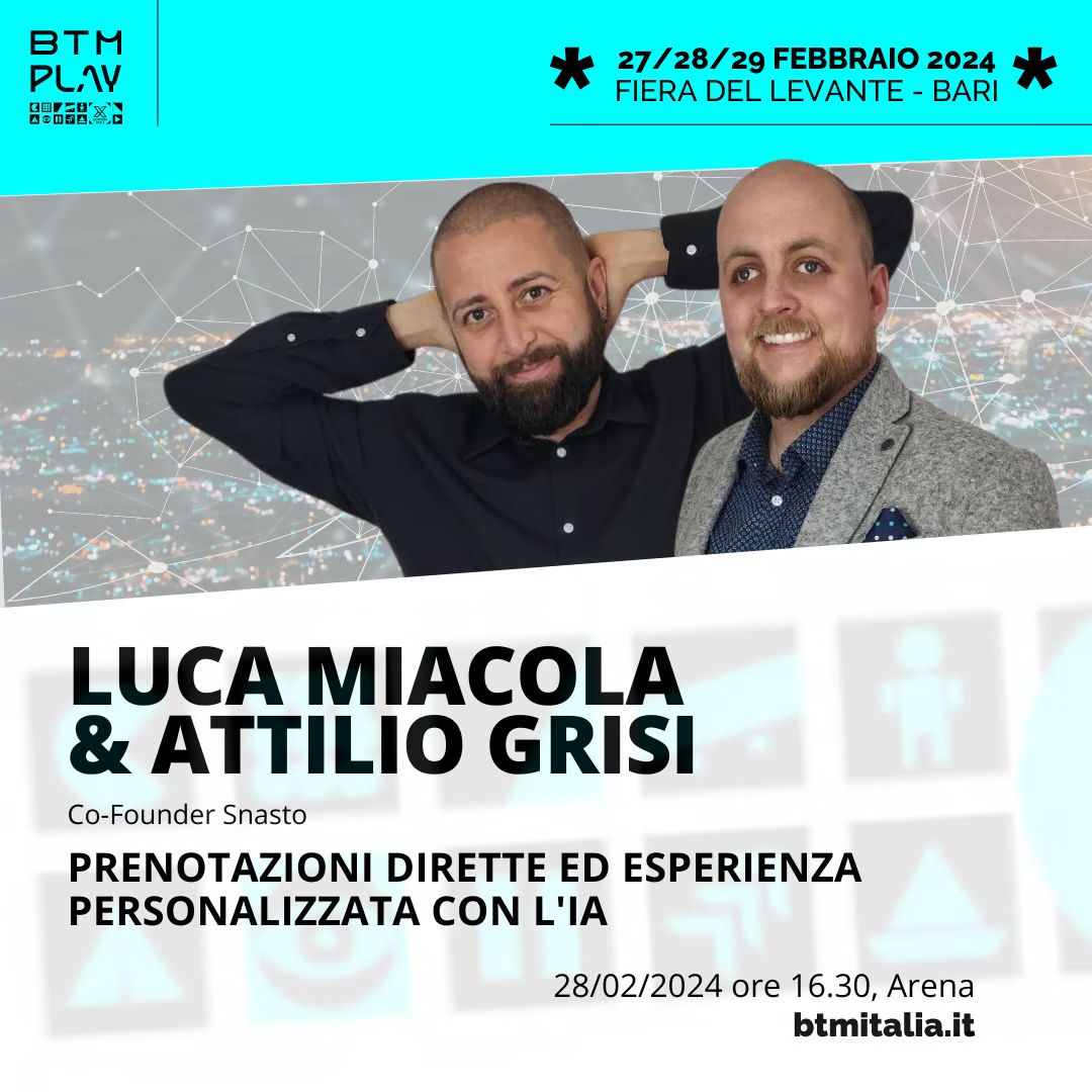 Oltre che al loro stand, Luca Miacola e Attilio Grisi (i fondatori di Snasto) presenteranno alcuni casi studio durante il loro speech, il  28 febbraio alle 16.30 nell’Arena della BTM a Bari.