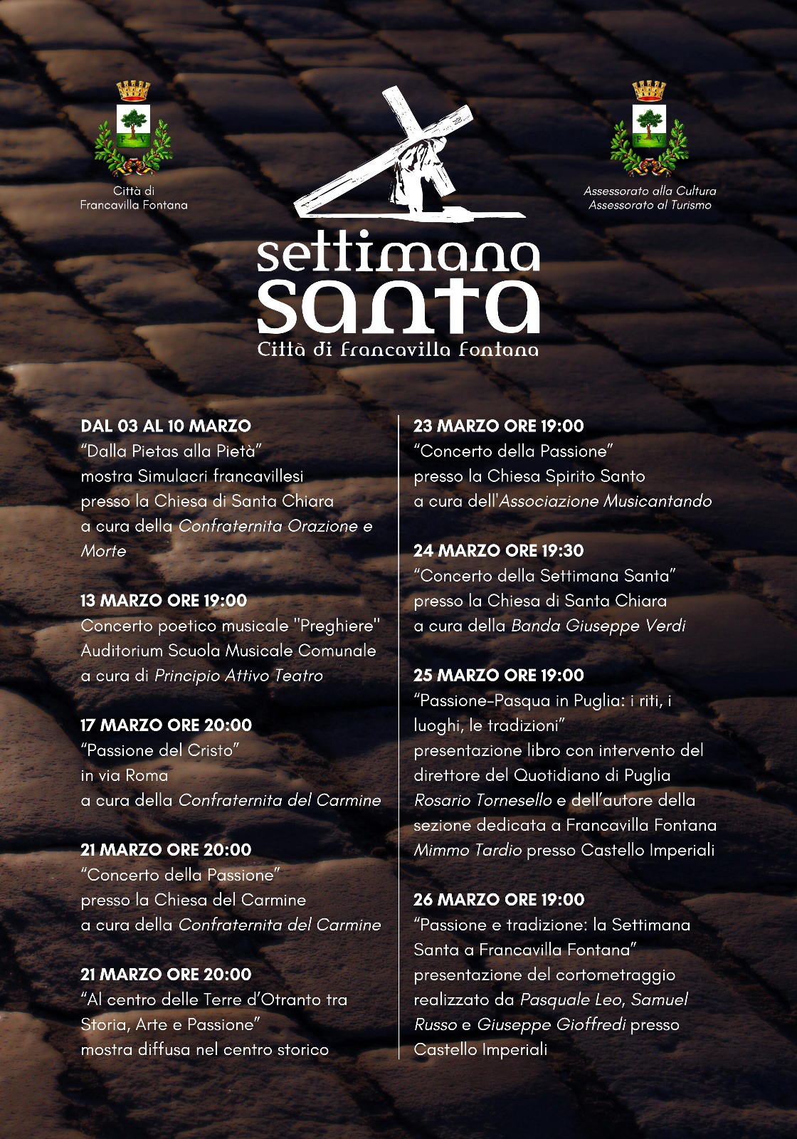 Giovedì 21 marzo, alle 20, nella chiesa del Carmine è in programma il “Concerto di Passione” a cura della banda Giuseppe Verdi diretta dal maestro Francesco Carrozzo. L’iniziativa è a cura della Confraternita del Carmine. Sempre giovedì 21 marzo prenderà il via la mostra immersiva nel centro storico “Al centro delle Terre d’Otranto tra Storia, Arte e Tradizione” a cura dell’Amministrazione comunale con le immagini dei fotografi che hanno partecipato al relativo avviso pubblico. L’obiettivo è proporre un percorso immersivo nel cuore del centro cittadino alla scoperta del patrimonio materiale e immateriale di Francavilla Fontana.