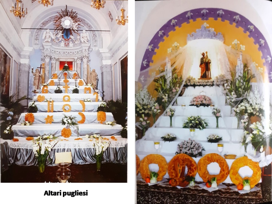 In Puglia le modalità espressive di tale devozione non differiscono di molto. L’offerta del pane votivo (‘roti ti san Giseppu’) e l’artistica realizzazione degli altari di San Giuseppe, «autentiche e preziose architetture dell’anima» (V. Musardo Talò, “Architetture dell’anima. I magici altarini di san Giuseppe”, p. 134) è fortemente sentita dal Gargano al Salento e anche in alcuni centri del tarantino (soprattutto nelle comunità albanofone, come Monteparano e San Marzano di San Giuseppe, paesi nei quali questi riti ebbero il compito di mediare il passaggio a una religione diversa da quella di origine, ma anche in altri paesi come Faggiano, Fragagnano, Lizzano, Sava). Particolarmente «fascinosi» gli altari allestiti a Monteparano, la cui architettura è unica in Puglia, con ben sette gradini (a simboleggiare i sette sacramenti): «Si partiva con la misura massima, che andava intorno ai quattro metri, per giungere a quello più corto, su cui si intronava il quadro grande o una bella statua di san Giuseppe col divino Infante o nella versione della Sacra Famiglia» (p. 138), tradizione, questa, mantenuta anche attualmente. Sempre a Monteparano, l’allestimento di un altare non poteva essere realizzato in casa delle ‘vacantìe’, cioè delle donne nubili, ma esclusivamente in quelle delle donne sposate (Un richiamo ai ‘Matronalia’ delle calende di marzo?). Qualunque motivazione muova i devoti alla sua realizzazione (promessa, grazia ricevuta o altro), l’altare configura «uno spazio simbolico, entro cui si accorciano le distanze tra l’immanente e il trascendente, tra la devota e il suo Patrono» (p. 138).