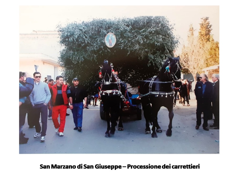 Tratti caratteristici presenta, in Puglia, la processione del Santo patriarca a San Marzano di San Giuseppe. Qui il rituale inizia la vigilia, con la benedizione dei pani in chiesa, proseguendo nel pomeriggio con la scenografica processione della legna, disposta su dei carri trainati da cavalli. La statua di san Giuseppe e la banda musicale chiude il corteo. Uno dei momenti più suggestivi è quello della ‘genuflessione dei cavalli’ davanti al simulacro del Santo, dopo la cerimonia di consegna delle chiavi al Santo patrono da parte del sindaco. La processione della legna prosegue fino al luogo prescelto per il falò in tarda serata.