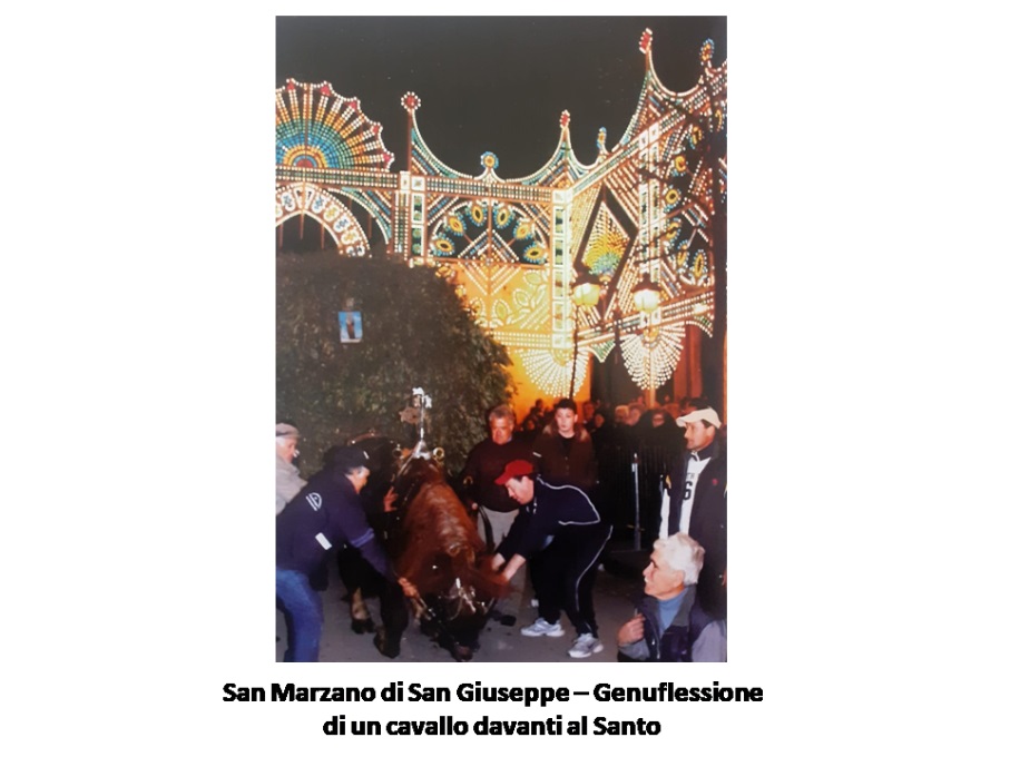 Nella prima parte del volume dedicata alla Sicilia, Domenico Scapati, in “La festa di San Giuseppe. Geografia cultuale in Terra di Sicilia”, scrive che «Affonda le sue radici nel medioevo la tradizione, secondo cui ogni anno la festa di san Giuseppe a Scicli viene onorata con una cavalcata, al cui passaggio per le vie della città si accendono i caratteristici falò che illuminano la notte, ricordando la fuga in Egitto di Giuseppe, Maria e del Bambino, in groppa ad un asino» (p. 29). Gli animali, da sempre bene primario e sinonimo di vita stessa per i contadini, vengono bardati con un manto di fiori, per poi essere premiati, a fine cavalcata, quelli con la bardatura migliore.