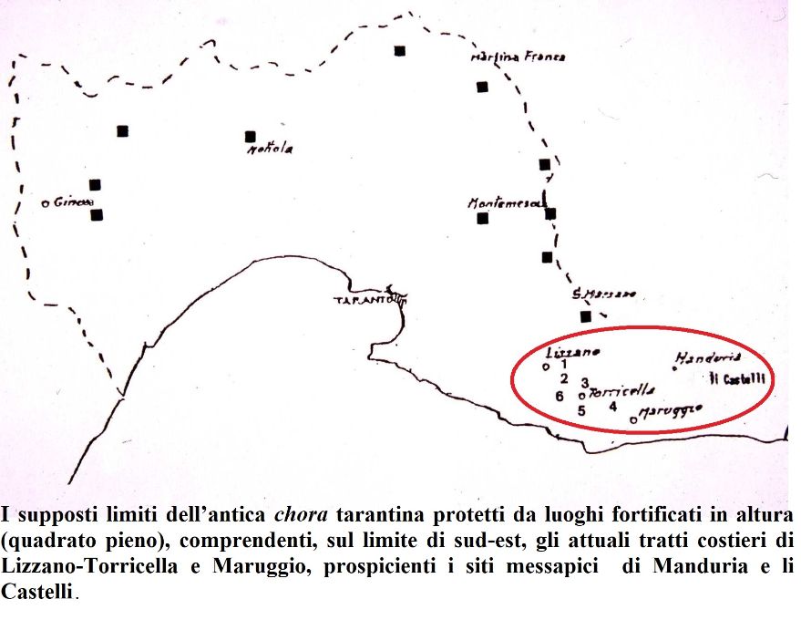 Questa espansione greco-tarantina sembra arrestarsi, lungo i nostri tratti costieri, all’altezza dei rilievi interni (le Murge o Serre tarantine), ove si ipotizzano una serie di avamposti fortificati (phrouria), sorti in altura a controllo e difesa del litorale da eventuali pericoli provenienti dalle popolazioni indigene confinanti.