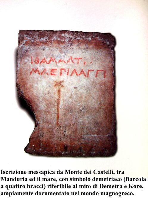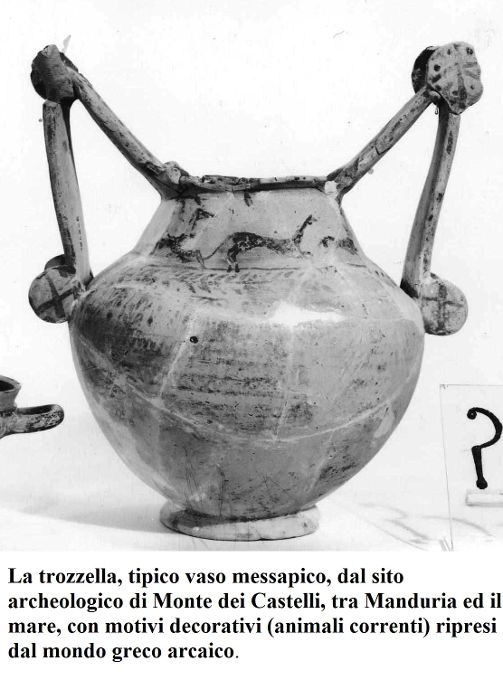 Popolazioni (indigene) che con i Greci non si fusero mai, conservando la loro lingua (vedi le tante iscrizioni messapiche provenienti dai predetti centri urbani), le loro tradizioni e le loro produzioni ceramiche, quali le “Trozzelle”, vasi tipici del mondo messapico, non presenti lungo il litorale; produzioni che, sin dai tipi più arcaici, mostrano forme e motivi decorativi mutuati dal mondo greco, a conferma di momenti di pace ed interscambio intercorsi tra queste popolazioni (greche e messapiche) confinanti.