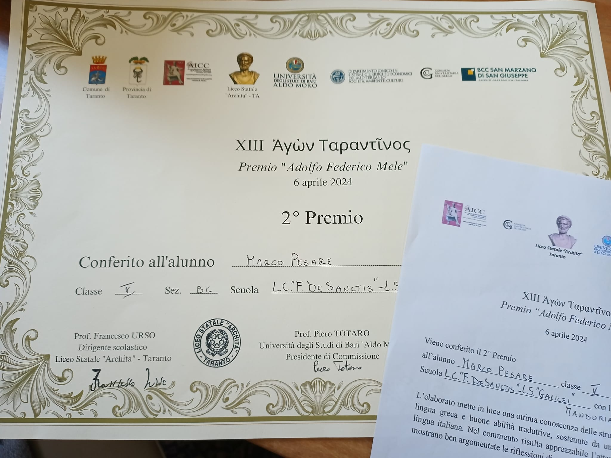 Marco Pesare (liceo classico “De Sanctis-Galilei”) si è classificato al secondo posto alla gara di traduzione di greco Agone Tarantino – Premio “Adolfo F. Mele”, confermando il brillante piazzamento dello scorso anno.