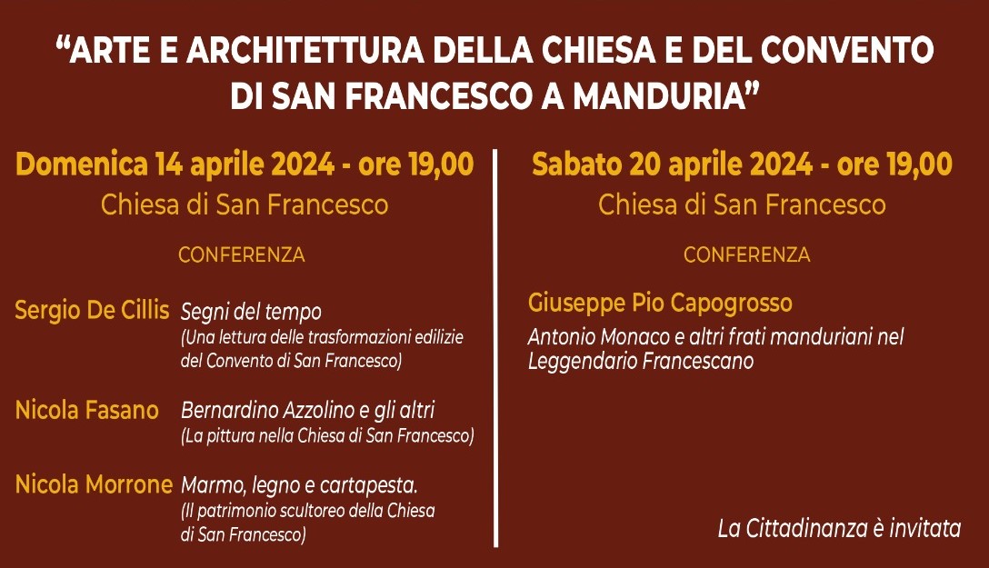 Quest’anno pertanto ricorrono i 550 anni della costituzione del convento di San Francesco a Manduria. Archeoclub, consapevole dell’importanza di questa istituzione per la città, del riferimento religioso, sociale e culturale che ha costituito per l’intera comunità cittadina e nel rispetto delle finalità statutarie di salvaguardia, tutela e valorizzazione del patrimonio culturale, collabora con la Fraternità nelle celebrazioni di questo importante anniversario con un incontro culturale domenica 14 aprile, alle ore 19, nella chiesa di san Francesco. Relazioneranno l’ing. Sergio De Cillis, Segni del tempo (Una lettura delle trasformazioni edilizie del convento di San Francesco a Manduria); il prof. Nicola Fasano, Bernardino Azzolino e gli altri( La pittura nella chiesa di San Francesco); il prof. Nicola Morrone, Marmo, legno e cartapesta (Il patrimonio scultoreo della chiesa di San Francesco ).