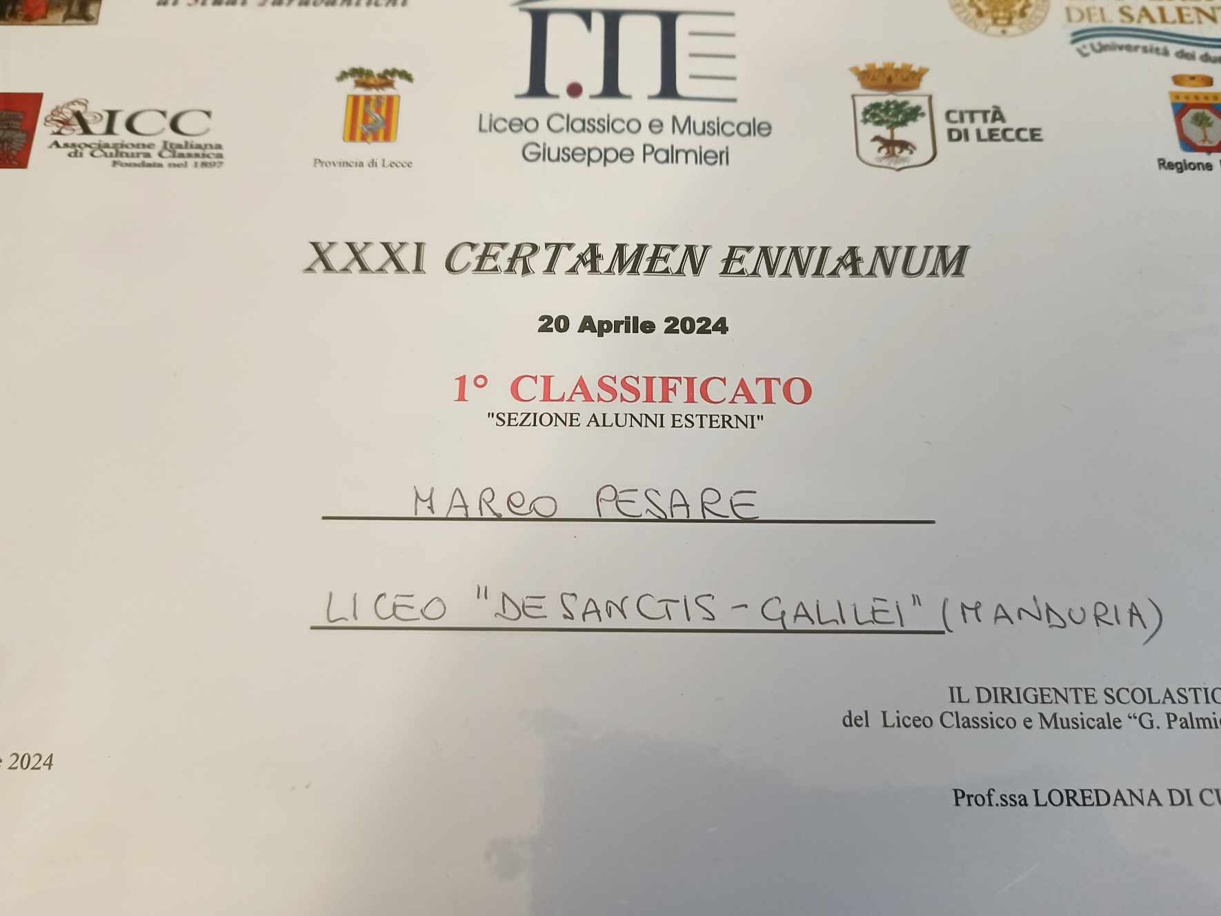 Lo studente Marco Pesare non finisce di stupire: ha vinto la XXXI edizione del Certamen Ennianum, gara internazionale di Lingua e cultura latina riservata a studenti dei Licei italiani ed europei.