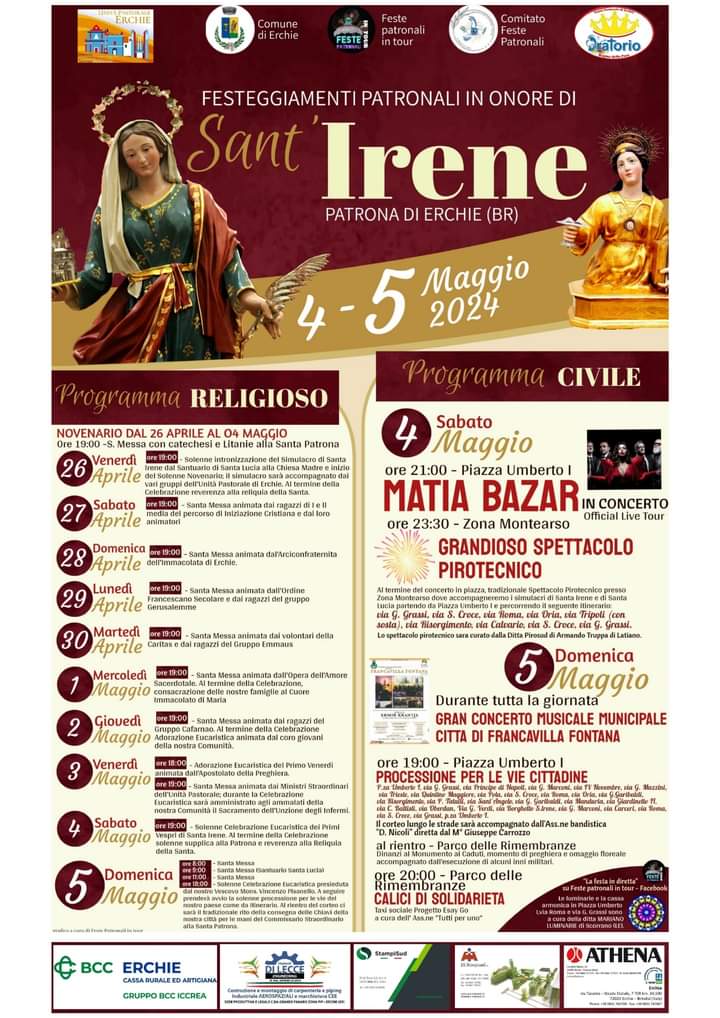 in occasione della Festa Patronale di Santa Irene, che quest'anno si celebra il 4 e 5 maggio, desidero rivolgere a ciascuno di voi un sentito messaggio di speranza, augurandovi ogni bene, serenità e profonda pace spirituale. Questa ricorrenza rappresenta per la nostra amata comunità un momento di grande importanza e solennità, un'occasione per rinnovare la nostra fede e per celebrare con devozione la nostra Santa Patrona. Non solo, ma per ogni cittadino di Erchie la festa di Santa Irene, che affonda le sue radici nella storia e nello spirito di questa città, diventa un'occasione preziosa per riunirsi e celebrare le tradizioni che legano tutti noi a questa terra.