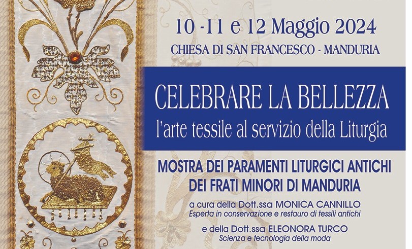 Per la XXX edizione di “Chiese Aperte”, la sede Archeoclub di Manduria ha organizzato, nei giorni 10, 11 e 12 maggio, la mostra “Celebrare la bellezza, l’arte tessile al servizio della Liturgia”, a cura delle dott.sse Monica Cannillo ed Eleonora Turco, in cui verranno esposti al pubblico i paramenti liturgici antichi dei Frati Minori di Manduria.