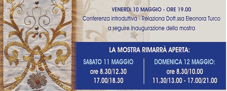 La mostra sarà inaugurata venerdì 10 maggio alle ore 19, al termine di una conferenza introduttiva della dott.ssa Turco e si potrà visitare anche sabato 12 (8,30 /12,30 e 17/ 18,30) e domenica 13 (8,30/10 e 11,30-13; 17/21).