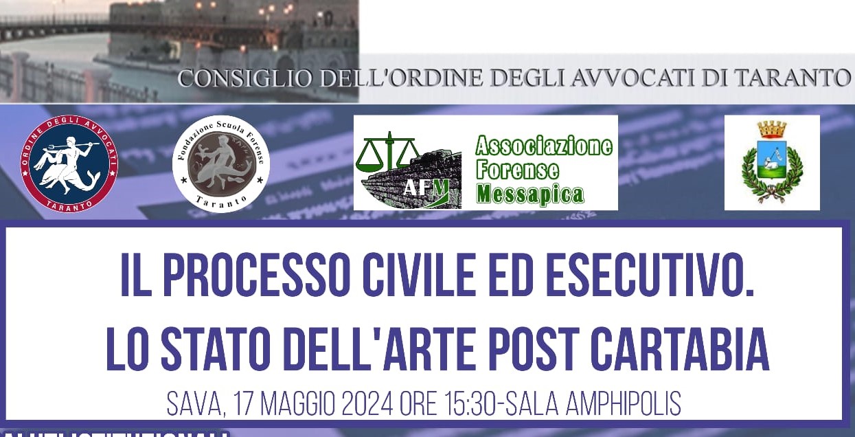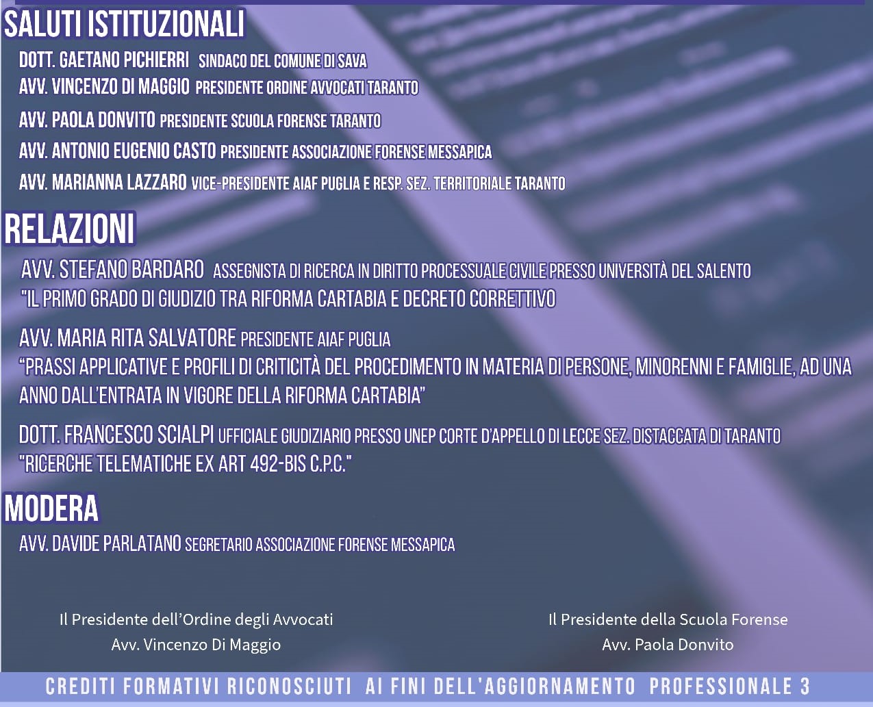 I lavori saranno aperti dai saluti istituzionali di Gaetano Pichierri, sindaco di Sava; Vincenzo Di Maggio, presidente Ordine degli Avvocati di Taranto; Paola Donvito, presidente Scuola Forense di Taranto; Antonio Eugenio Casto, presidente Associazione Forense Messapica: Marianna Lazzaro, vice presidente AIAF Puglia e responsabile sezione territoriale di Taranto.