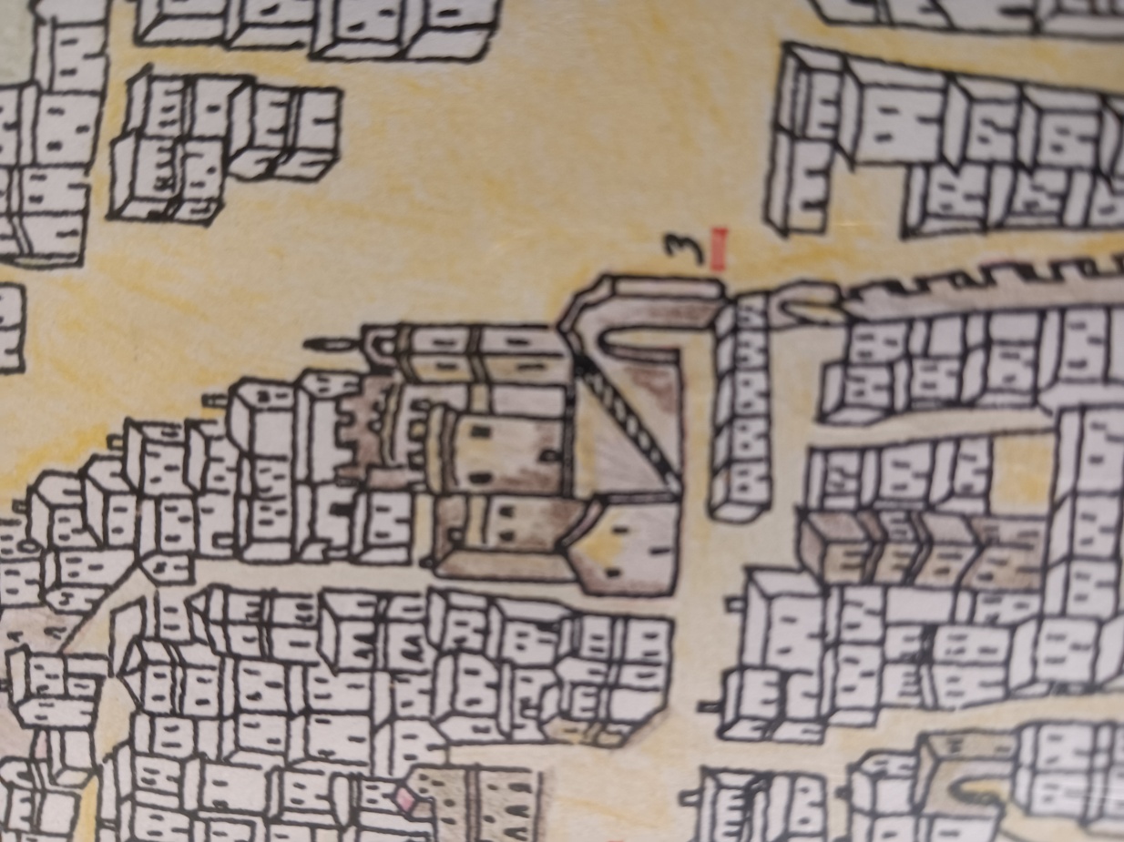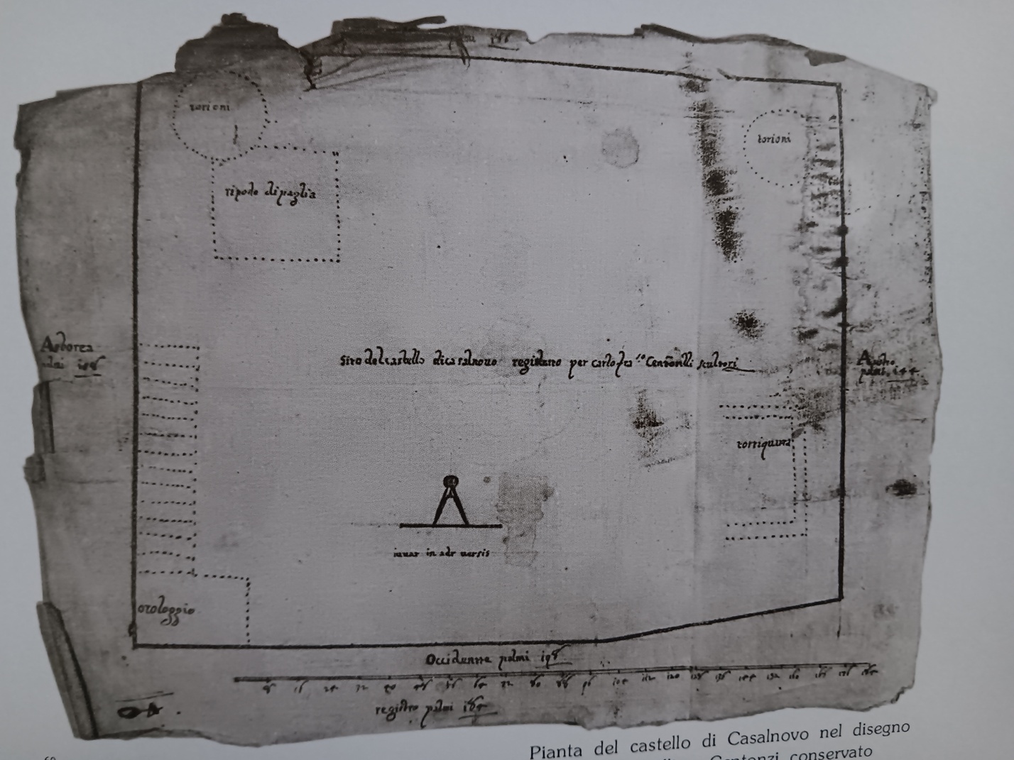 La raffigurazione in pianta del Centonze sembra coincidere con quella, che sia pure in maniera essenziale ed esemplificata, è riportata nella prospettiva di Casalnuovo del 1643 sempre rinvenuta nell’Archivio di Stato di Napoli, dove è possibile individuare gli stessi elementi strutturali della fortificazione riportati nella planimetria.