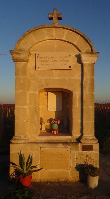 La ‘culonna ti San Pietru’. Sensibilmente diversa da quella esistente negli anni delle ricerche di Perretti appare, mentre si scrive (maggio 2024), l’edicola votiva dedicata alla Madonna e a San Pietro posta sulla S.P. 137 per san Pietro in Bevagna (coordinate GPS Google Maps 40°22'39.6"N 17°38'25.3"E).