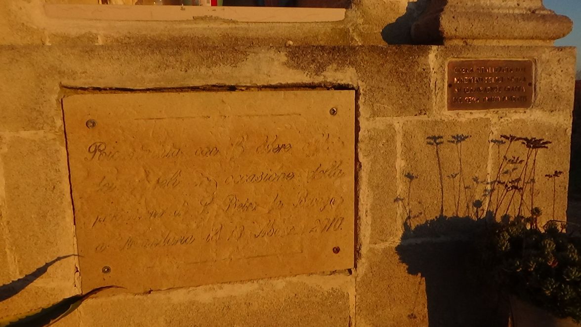Nella parte sottostante, un’altra targa reca scolpita nel tufo la seguente frase: «Ricostruita con le libere offerte / dei fedeli in occasione della / processione di San Pietro da Bevagna / a Manduria il 13 Marzo 2010».