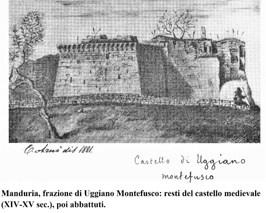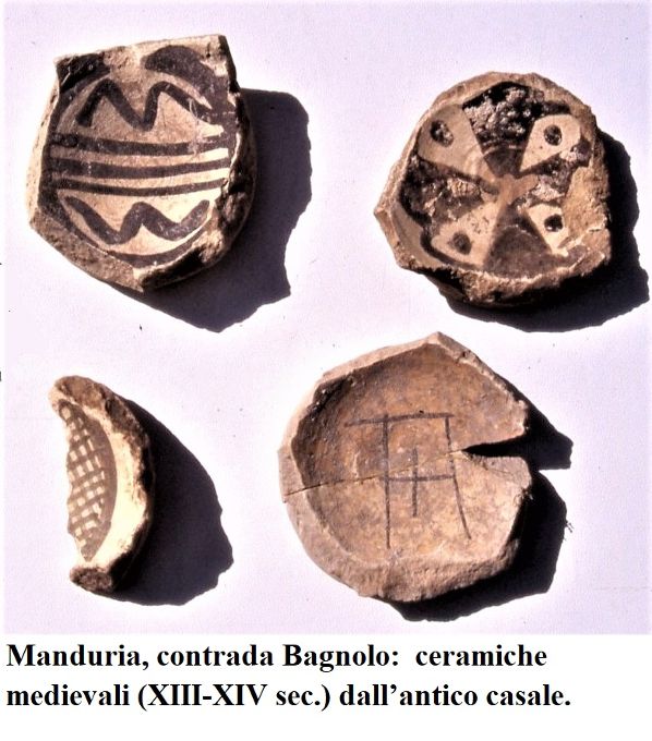 “Dal 977, epoca di sua ultima distruzione, al 1090, i superstiti manduriani scampati con la fuga all’eccidio vissero sbandati per le campagne e foreste; ed io ritengo che lungo il periodo di 93 anni abitarono in quelle antiche contrade di questo feudo che ancora oggi portano i nomi di S. Giovanni, S. Anastasio, S. Maria di Bagnolo, S. Angelo. Queste contrade danno ancora a vedere traccie e manifesti segni di piccole colonie quivi stabilitesi, come: avanzi di fondamenta e sepolcreti improntati dall’Alfa ed Omega, oltre le crocette, medaglie ed altri segni devoti, indizio certo di sepolcri cristiani” (da L. TARENTINI, Cenni storici di Manduria antica - Casalnuovo - Manduria restituita, Taranto 1901, p. 112).