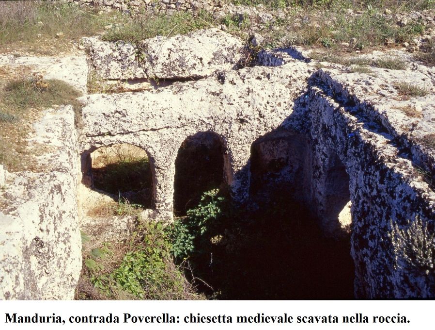 I significativi resti di strutture rupestri sono visibili nel territorio di Manduria: chiesetta ipogea di San Pietro Mandurino, la chiesetta ipogea in contrada Poverella, gli impianti rupestri di Castelli e Maserinò