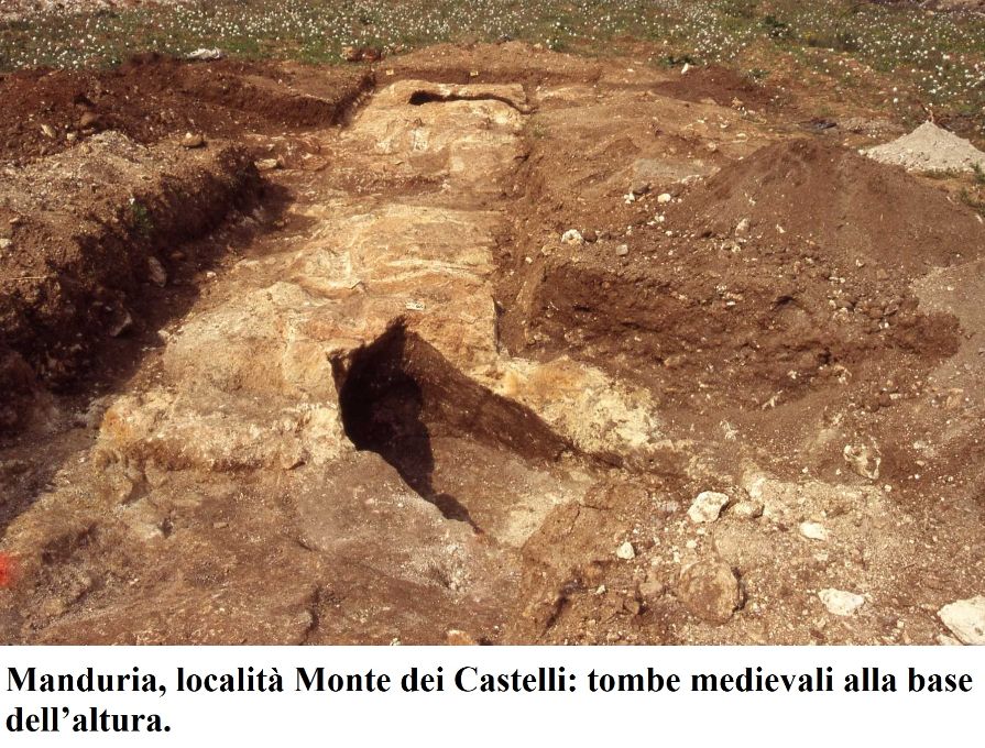 Per quanto concerne Manduria, il Medioevo rappresenta un periodo alquanto confuso, piuttosto “oscuro” nelle sue fasi iniziali, sulle quali le fonti tacciano o si limitano a semplici “cronache”, spesso frammentarie ed indirette. In genere gli storici locali assimilano la sorte di Manduria a quella di Oria, distrutta, secondo la cronaca di Lupus Protospatarius, nel 924 e nel 977 e ricordano anche l’arrivo in città del re goto Totila nel 542. Un’altra fonte (anonimo uritano) riferisce che Ruggiero il Normanno, fratello minore di Boemondo d’Altavilla, diede ordine di ricostruire la città in un angolo dell’antica Manduria, con la costituzione di un agglomerato di nuove case, chiamato, appunto, Casalnuovo (vedi S. DE VITIS, Insediamenti e problemi dell’archeologia tardoantica e medievale nel territorio di Taranto (sec. IV-XV), Taranto 2003, p. 79).