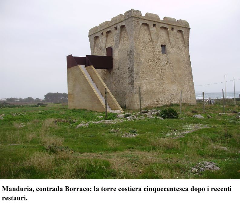 Sempre nel periodo normanno-svevo sul territorio pugliese si sviluppa lo stile Romanico, che arricchisce la nostra regione di splendide cattedrali. Torri e castelli caratterizzano sempre più l’habitat dell’epoca, vessato dai frequenti scontri tra gli Angioini e gli Aragonesi (XIII-XV sec.) subentrati agli Svevi nel dominio sulla Puglia; opere di fortificazione caratterizzano anche l’epoca di Carlo V, che nel XVI secolo avvia una lunga dominazione spagnola sul nostro Meridione, protrattasi, con il breve intervallo del decennio napoleonico “1806 -1815”, fino all’Unità d’Italia. Con Carlo V si progetta, tra l’altro, un articolato sistema di torri costiere (in parte ancora visibili lungo le coste del Regno di Napoli) in difesa dai continui assalti pirateschi portati dal mare (vedi eccidio di Otranto del 1480). Ed intorno a torri e castelli (ben documentati anche in territorio di Manduria ed in comuni viciniori), si raggrupperanno gradualmente le popolazioni provenienti dai casali, avviando, così, la costituzione di quegli aggregati urbani che rappresentano, oggi, i nuclei storici degli odierni centri urbani.