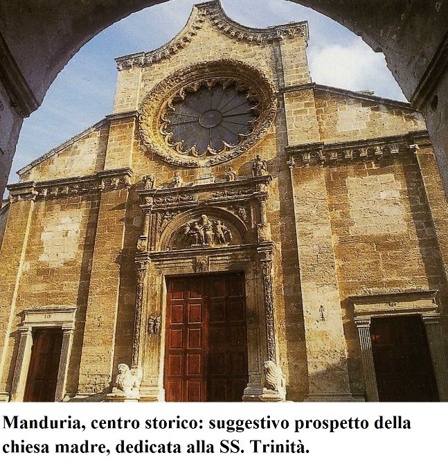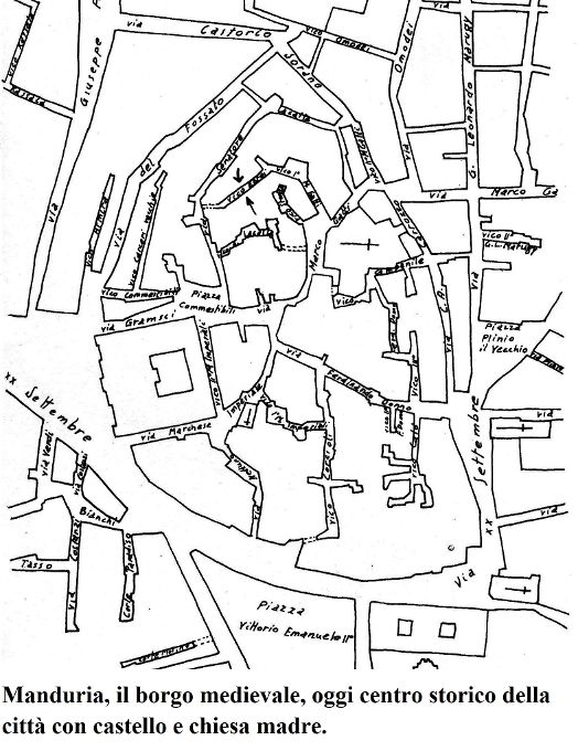 “(I casali) furono tutti abbandonati quando gli abitanti, protetti dai Re Normanni potettero costruirsi ed abitare un nuovo casale sorto sulle rovine dell’antica città … Casalnuovo fu edificato nell’angolo sud-ovest del pomerio della antica Manduria e perciò le antiche mura, riattate, servirono a difesa del nuovo villaggio. Solo dal lato di levante fu necessario costruire una cinta muraria ma di dimensioni e robustezza molto minori di quelle antiche … Cosicché Casalnuovo, all’inizio della sua vita, ebbe al centro la chiesa Madre, dedicata alla SS. Trinità, vicino alla piazza delle erbe, ove era il castello… Aumentandosi la popolazione si sentì il bisogno d’ingrandire Casalnuovo e si costruirono nuove abitazioni fuori dalla cinta muraria” (da G. ARNO’, Manduria e Manduriani, Manduria, A. Marzo, 1983 - rist. ed. 1954 - pp. 23, 25).