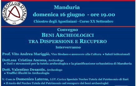 Relazioneranno Cristina Ancona, archeologa, su “Dati e strumenti per la tutela archeologica e la pianificazione urbanistica di Manduria”; Valentino Desantis, archeologo e socio Archeoclub, su “Traffici illeciti di Archeologia”; il vice comandante Domenico Laterza, LGT. Carica Speciale Nucleo Tutela del Patrimonio di Bari su “Il ruolo del Nucleo Tutela del Patrimonio nel recupero dei Beni archeologici”.