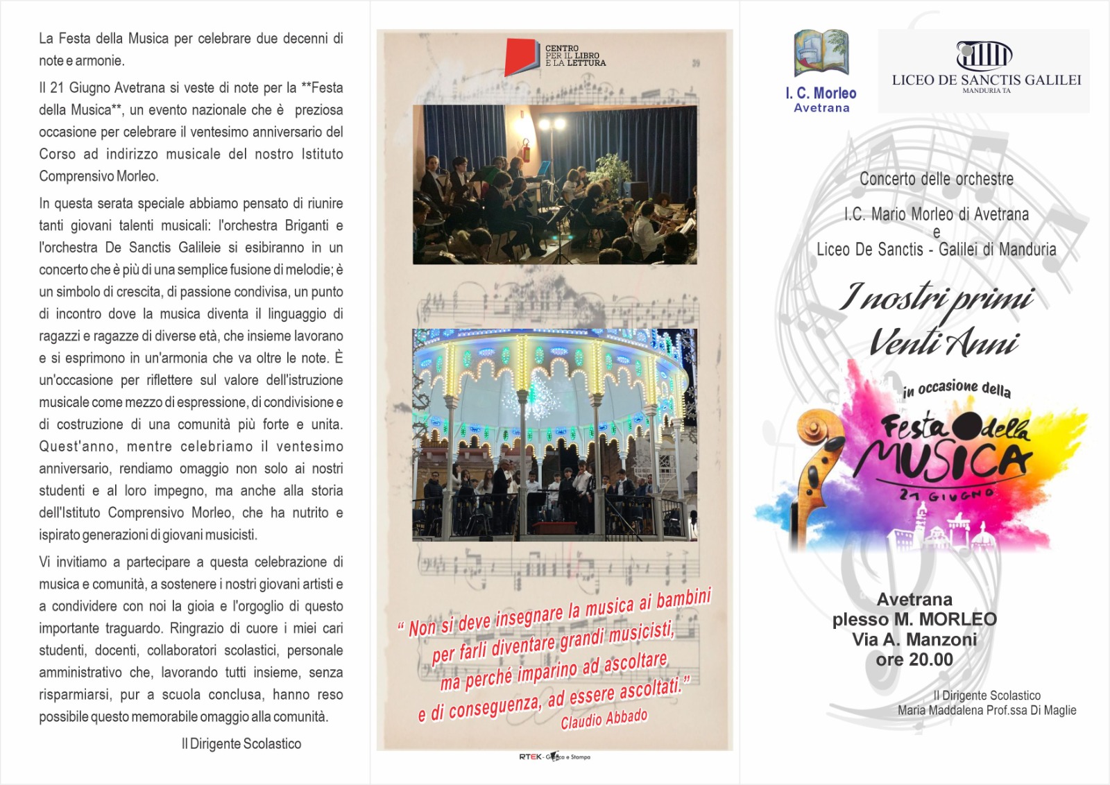 Quest'anno, mentre celebriamo il ventesimo anniversario, rendiamo omaggio non solo ai nostri studenti e al loro impegno, ma anche alla storia dell'istituto comprensivo Morleo, che ha nutrito e ispirato generazioni di giovani musicisti.