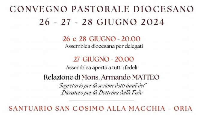 Mercoledì 26, giovedì 27 e venerdì 28 giugno la Diocesi di Oria vivrà il Convegno Pastorale Diocesano, presso il Santuario di San Cosimo alla Macchia in Oria, con inizio dei lavori assembleari alle ore 20, presieduti dal vescovo Vincenzo.