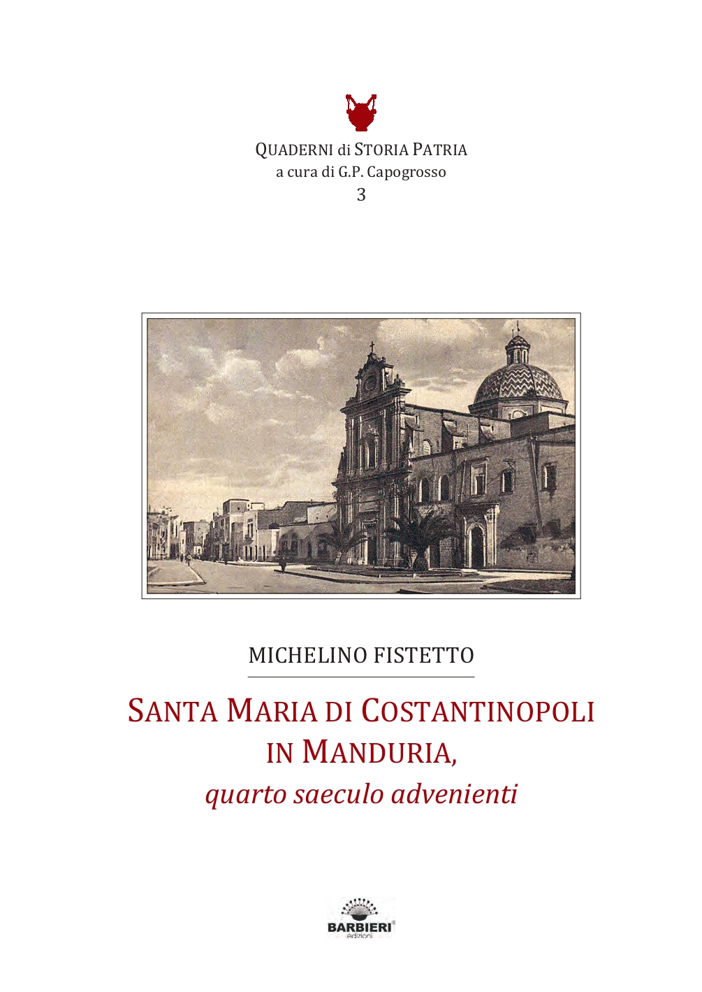 Il terzo numero dei «Quaderni di Storia Patria», Santa Maria di Costantinopoli in Manduria, quarto saeculo advenienti, del prof. Michelino Fistetto, è la sintesi di una più corposa ricerca storica condotta dall’autore sulla chiesa di Santa Maria di Costantinopoli e l’annesso monastero dei Padri Agostiniani di Manduria.