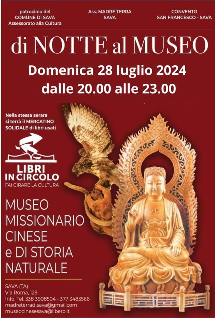 Nuovo appuntamento con “Di Notte al Museo”: oggi (domenica) sarà possibile visitare il museo Missionario Cinese di Storia Naturale di Sava dalle 20 alle 23.