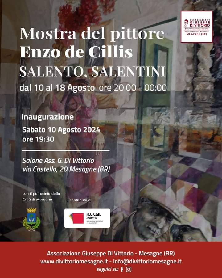 Dal 10 al 18 agosto, il salone dell’associazione G. Di Vittorio, in via Castello 20 a Mesagne, ospiterà la mostra personale del pittore Enzo de Cillis, visitabile ogni sera dalle ore 20 alle ore 24. L'inaugurazione si terrà sabato 10 agosto alle 19,30 e sarà introdotta da una presentazione del prof. Ennio Pascarella.