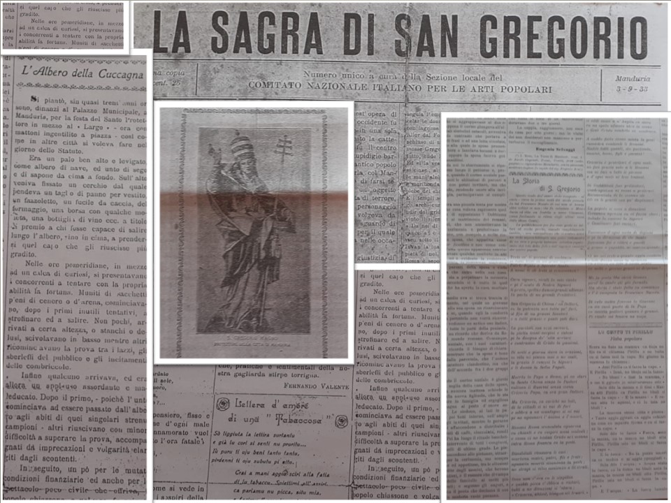 Il 3 settembre 1933, in occasione delle celebrazioni per la festività del Santo Patrono, venne pubblicato a Manduria un foglio giornalistico, numero unico, dal titolo «La Sagra di San Gregorio». Si tratta di un giornale di quattro pagine, di grande formato, colore arancione, edito dalla locale sezione del Comitato Nazionale Italiano per le Arti Popolari, curatore principale Eugenio Selvaggi (giornalista, collezionista, cultore di storia patria), redattore Fernando Valente (con lo pseudonimo di Ferva). Di alcuni articoli contenuti nel foglio (una poesia di Francesco Nasuti dal titolo “La storia di San Gregorio”, una fiaba popolare dal titolo “Lu cuntu ti Pirillu” di Salvatore Chimienti) si è scritto su questa pagina negli anni scorsi.