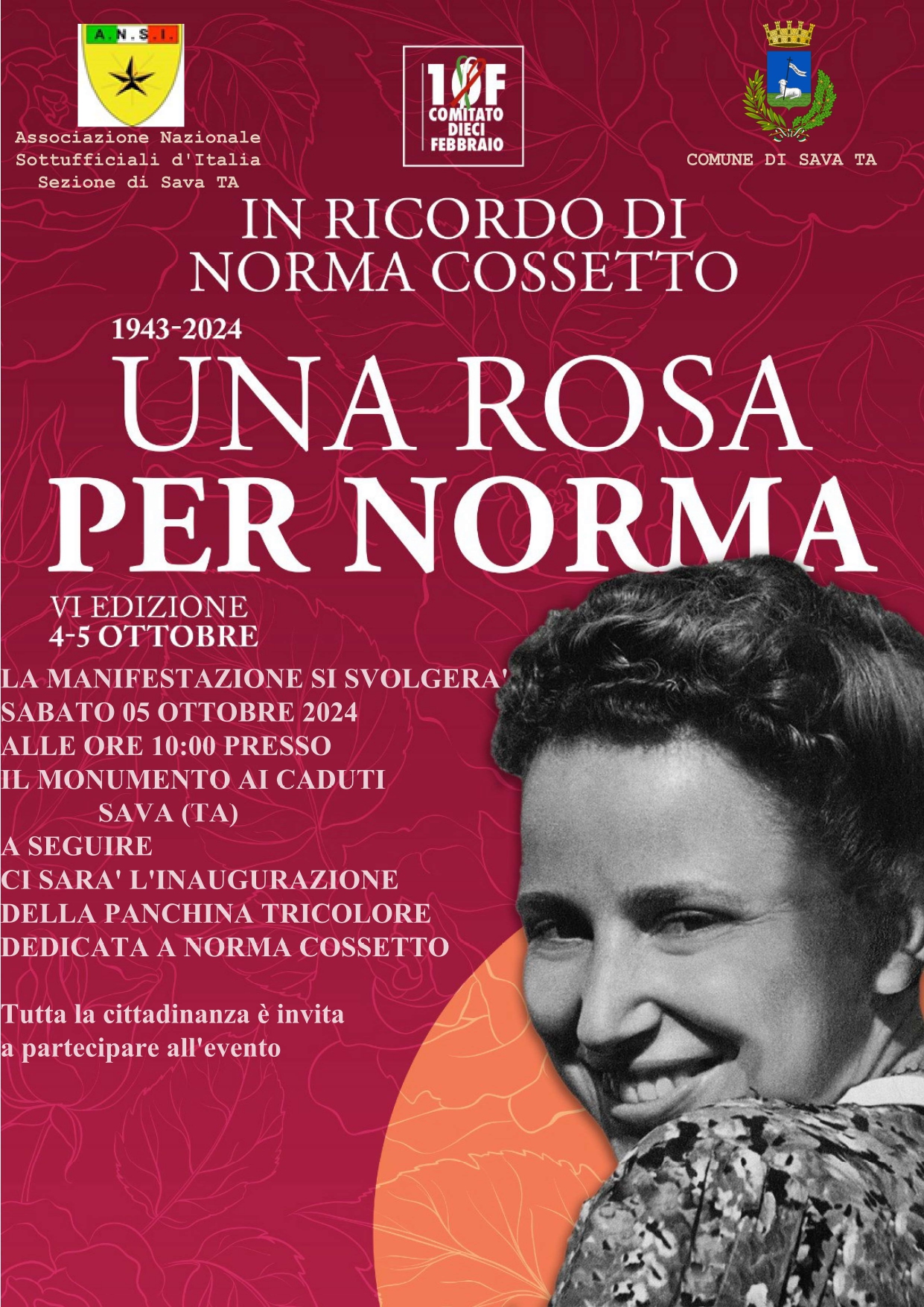 Si svolgerà sabato 5 ottobre, alle ore 10, presso il monumento ai Caduti di Sava, la manifestazione “Una rosa per Norma Cossetto”, promossa in tutta Italia dal Comitato 10 Febbraio.