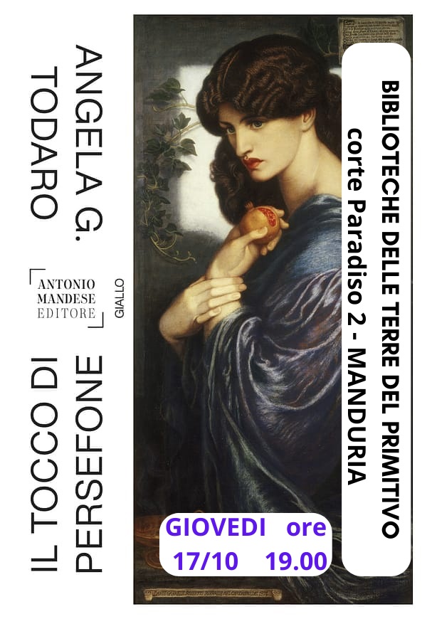 Il primo appuntamento della rassegna è dedicato proprio al thriller storico che affonda le radici nella sorprendente Puglia Magnogreca, con una particolare attenzione all’aspetto femminile dell’indagine sociale. “Il tocco di Persefone”, di Angela Giovanna Todaro, pubblicato per i tipi di Antonio Mandese Editore, è reduce dal Salone del Libro di Torino e nella sua specificità di genere rende in modo unico e personale gli angoli storici della Città dei Due Mari. Dialoga con l’autrice lo scrittore Giuse Alemanno.