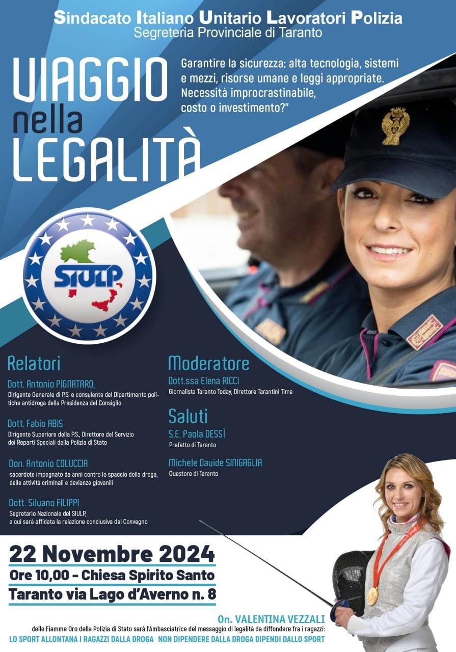 Si parlerà di legalità e sicurezza nel corso del convegno organizzato dalla segreteria provinciale di Taranto del Sindacato Italiano Unitario Lavoratori Polizia (SIULP), in programma venerdì 22 novembre e che vedrà, tra gli altri, la presenza dell’on. Valentina Vezzali, campionessa del gruppo sportivo della Polizia di Stato Fiamme Oro e ambasciatrice del messaggio da diffondere ai ragazzi: «Lo sport allontana dalla droga. Non dipendere dalla droga, dipendi dallo sport».