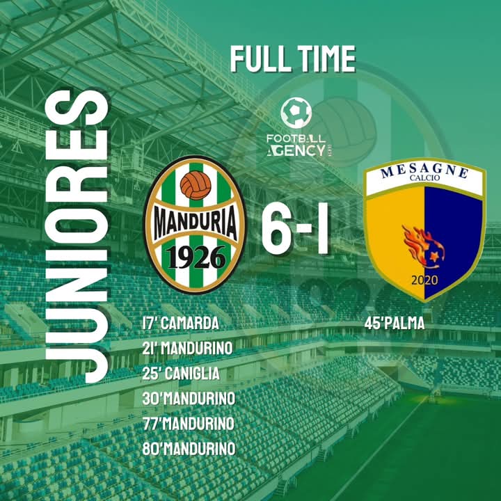 Sonante vittoria per la squadra juniores del Manduria: 6-1 a Mesagne. Apre le danze il solito Camarda. Dopo poco si sblocca Mandurino con un gran sinistro sul secondo palo. Il terzo gol lo segna Caniglia con un tiro da fuori che si insacca alle spalle del portiere. Poi ancora Mandurino su punizione segna il quarto gol. Al 45' prova una timida reazione il Mesagne con il gol di Palma.
