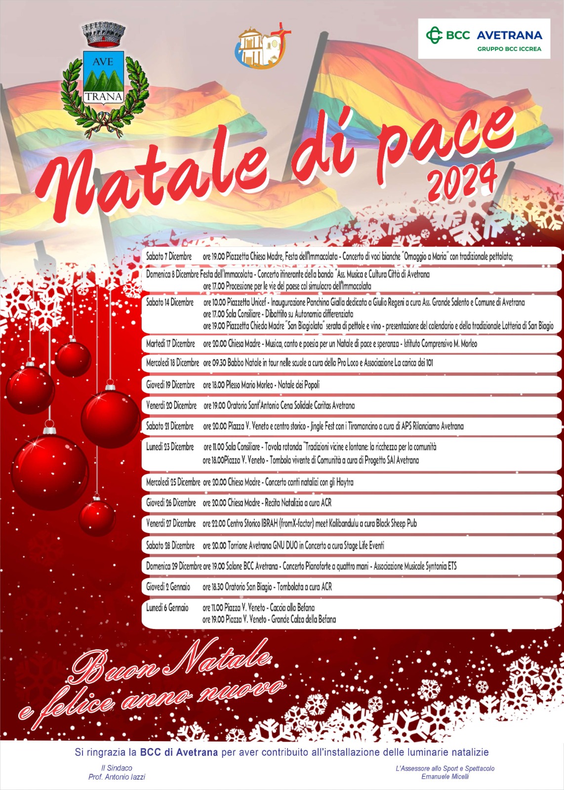 «Il Comune di Avetrana è riuscito a realizzare questo programma grazie alle associazioni locali, commercianti, istituto comprensivo “M. Morleo” e Unità Pastorale, siamo riusciti a realizzare questo programma» le parole dell’assessore Micelli. «Anche quest’anno, il messaggio che si vuole lanciare è quello della Pace».