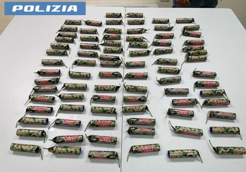 Nel corso della perquisizione, i poliziotti in una piccola mansarda adibita a stanza da letto hanno rinvenuto, pericolosamente accatastati tra loro all’interno di una busta di tela, quasi 100 petardi dal peso lordo di 40 grammi ciascuno.