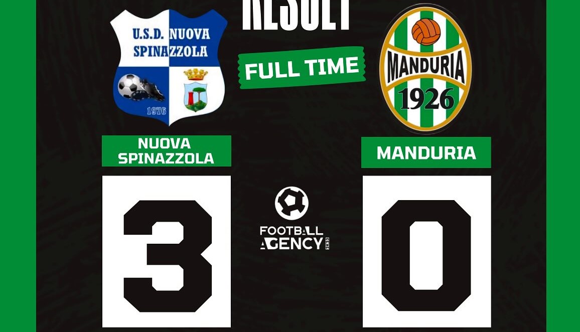 Un Manduria poco incisivo subisce tre reti dallo Spinazzola. I biancoverdi, malgrado un maggior possesso di palla, in particolare nella prima frazione di gioco, hanno tirato a rete una sola volta.
