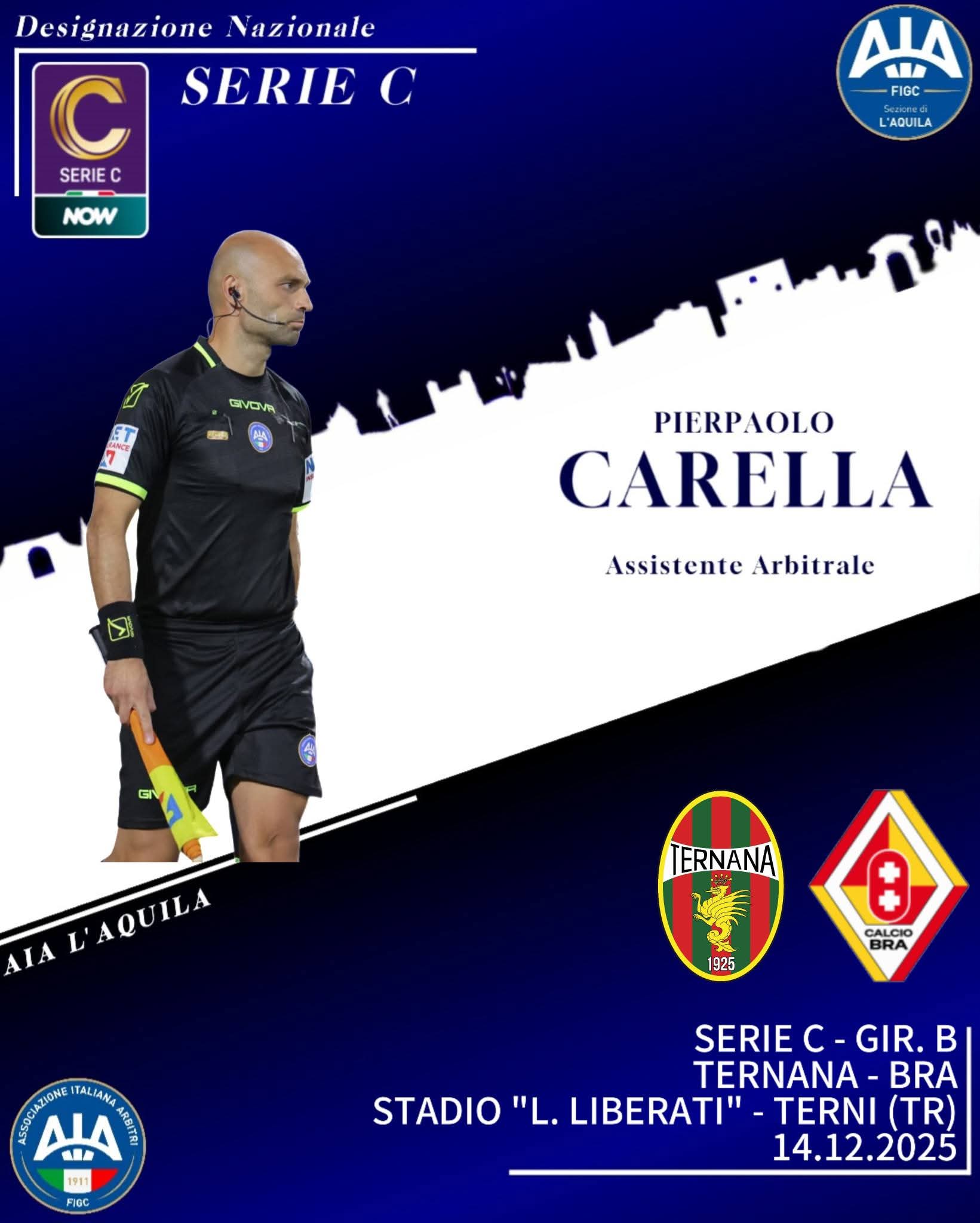 Pierpaolo Carella (AIA L’Aquila) designato come assistente della partita fra Ternana e Torres. L’incontro, in programma domenica pomeriggio (calcio d’inizio alle 15) allo stadio “Liberati” di Terni, è inserito nel programma della prossima giornata del girone B della serie C.