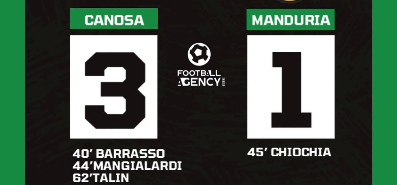 Brutta sconfitta per il Manduria che gioca l’ultima mezz’ora in dieci. Una sconfitta che davvero non ci voleva, quella maturata contro il Canosa, mostratasi squadra coriacea e ben disposta in campo. Anche se i biancoverdi erano privi di alcuni titolari, non hanno demeritato nella prima fase di gioco, riuscendo anche a segnare un goal e quindi ad accorciare le distanze. Da sottolineare che il Manduria ha dovuto giocare in dieci l’ultima mezz’ora per l’espulsione di Chiochia.